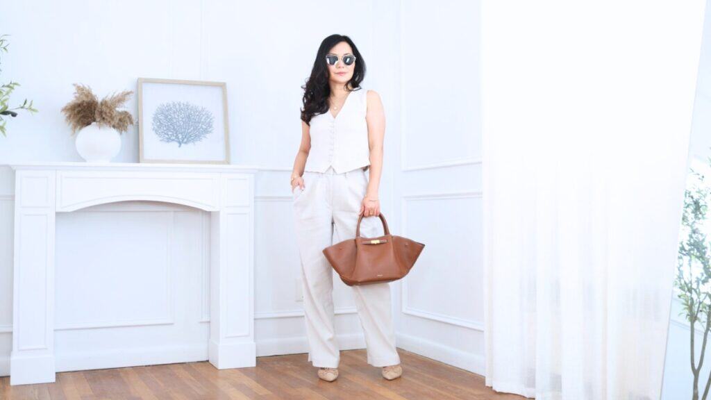 Since palazzos already have so much volume, I always keep the top visually narrower. That doesn’t mean skin-tight, just more fitted or cropped so my proportions stay balanced. I often wear a shrunken-fit cardigan that’s slightly cropped and tuck in just a bit. That small tuck defines my waist and keeps the wide-leg silhouette from overwhelming my shorter frame.