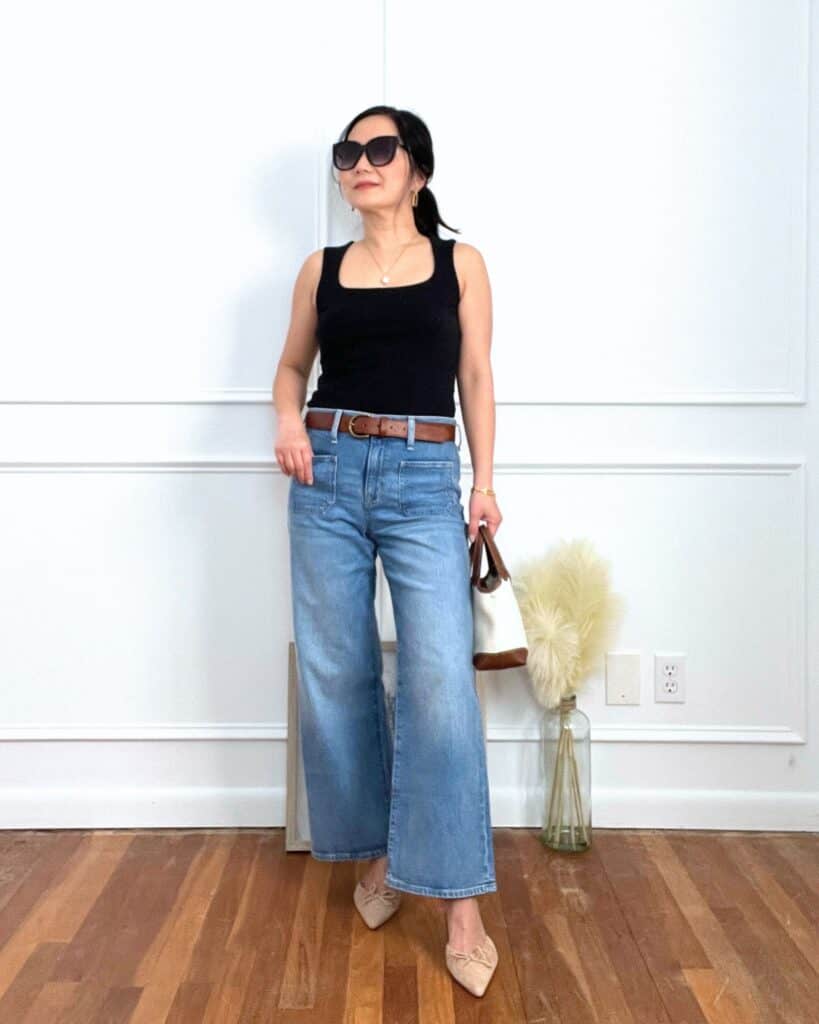 You can never go wrong with a black and denim combo. I wore a fitted sleeveless black top tucked into high-rise wide-leg jeans for this look, and it’s such a simple but flattering pairing. Tucking in the top helps define the waist, and the wide-leg jeans add drama without overwhelming my petite proportions—again, the key is the high waist and the right inseam length.