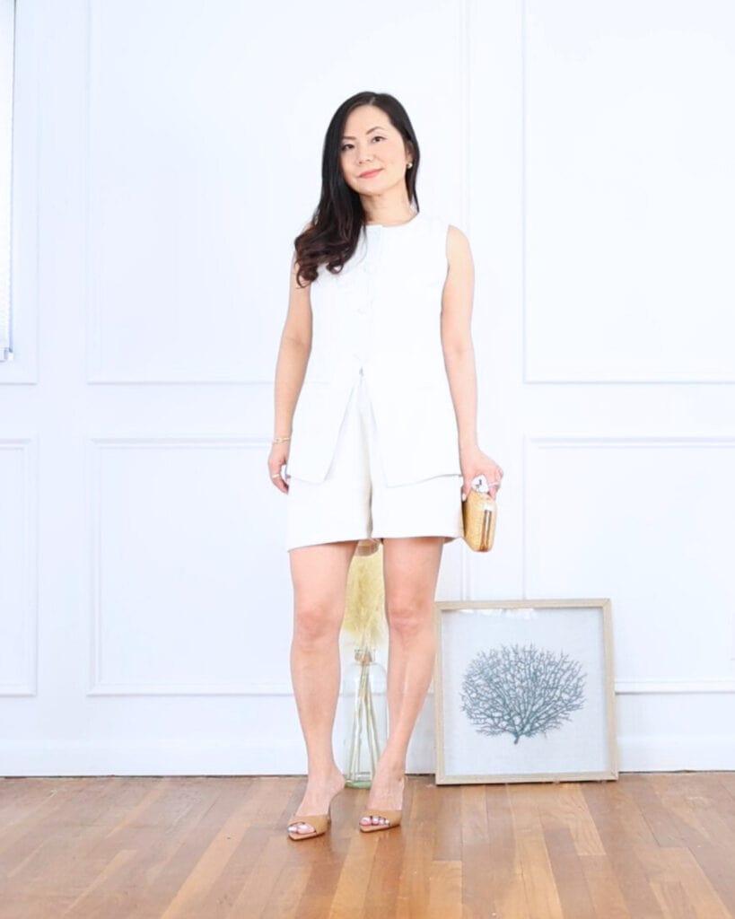There’s something about a matching set that just screams vacation—and this white-on-white combo is as fresh as it gets. The sleeveless top is light and breezy, and the linen shorts have a relaxed but tailored fit that’s perfect for petites. I love how the monochrome look visually elongates the body. Peep-toe heels give a slight lift and add polish, but I’ve also worn this look with flat sandals when I’m heading to the beach. It’s effortlessly chic and so comfortable on those especially hot summer days.