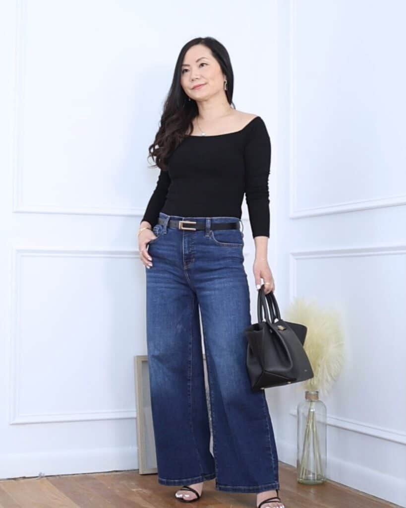 I love how a boat neck top instantly feels elevated. The neckline draws attention to the shoulders, which balances out the wide-leg jeans. Adding a skinny black belt keeps the waist defined, and strappy sandals make the outfit feel light and polished.