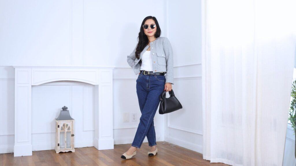 This outfit is one of my everyday favorites. A cropped jacket layered over a simple white top keeps things neat and proportional. High-rise jeans elongate the frame, while a leather belt ties the look together. Flat shoes keep it easy and comfortable for walking around.
