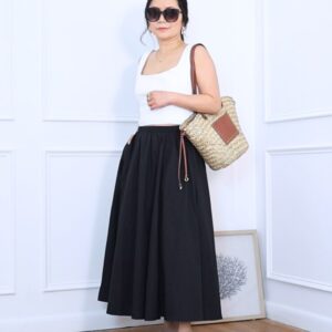 This outfit is a little more casual-cool, and it’s one I reach for often. I started with a fitted black cotton tank top—something about the simplicity just works. I tucked it into a pair of high-waisted mom jeans and added a classic black leather belt to define the waist.