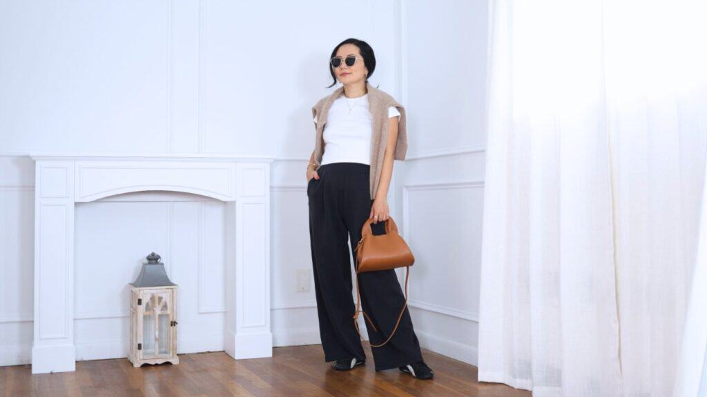 A premium white tee will never fail you and that’s what I feel about this one I’m wearing from Aritzia. It’s supposed to be a rib cropped tee but since I’m 5’2, it’s the perfect length for me. It especially looks good with my high-waisted bottoms like this pair of wide-leg pants from Amazon.