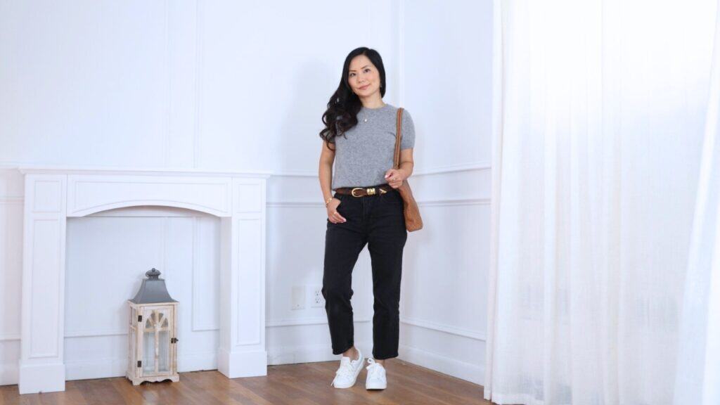 Let me start with this outfit which is something I wear to go to my son’s school volunteering activity. It’s super casual and cozy (as what Cashmere sweaters are all about) but at the same time, still very presentable. What I like about this cashmere sweater I got from Quince is that I can actually work around its neckline to give it a bit of a style twist.
