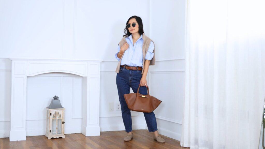 This outfit feels “cool-girl classic” but still very approachable. I wore my blue button-down slightly unbuttoned for a relaxed vibe and tucked it into my dark ankle jeans to highlight my waist. To make it even more effortless, I layered a cashmere sweater over my shoulders — it adds dimension without bulk.