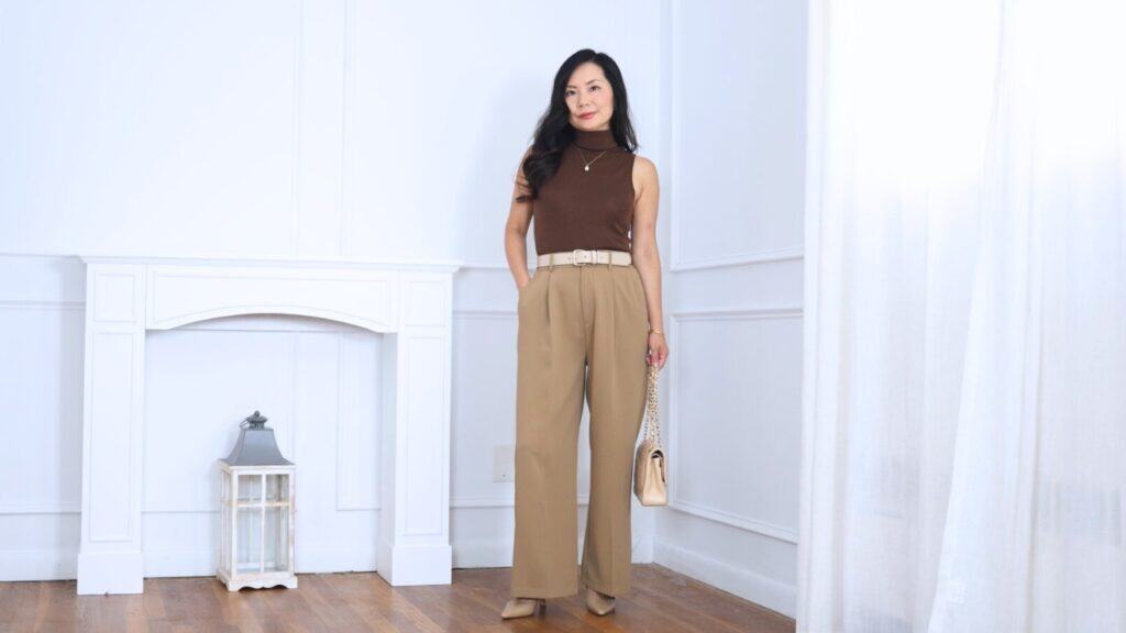 One of my favorites lately is a sleeveless turtleneck top in a soft knit paired with flowy wide-leg pants. The knit keeps me cozy, the pants add movement, and together they feel effortless. The cut also gives me a longer line, which is especially helpful at 5’2”.