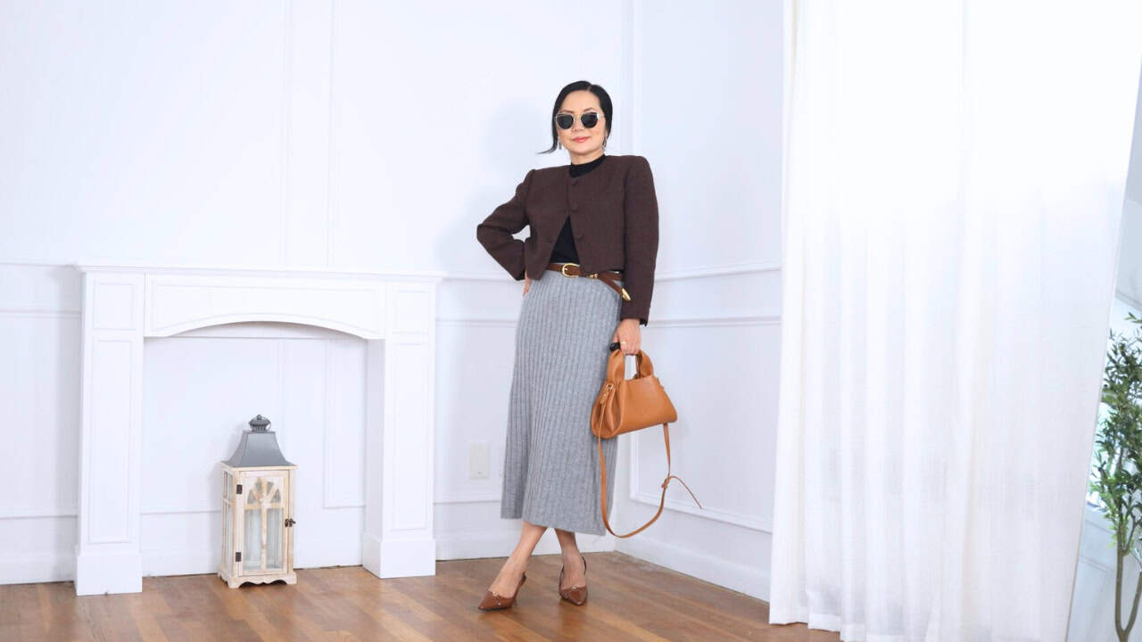 This combination proves that small details can elevate an outfit instantly. A cropped jacket highlights the waist, which is especially flattering on a petite frame. The high-neck black top underneath adds sleekness, while the skinny belt defines shape. A ribbed gray skirt adds texture and keeps the look refined. Pointed-toe heels pull everything together and elongate the legs.
