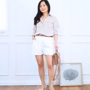 To keep it flattering, I usually roll the sleeves and do a casual front tuck. It’s a simple styling trick, but it makes a big difference in creating shape and balance. Petite tip: avoid oversized shirts that go past the hips. A more tailored fit works better and is easier to tuck.