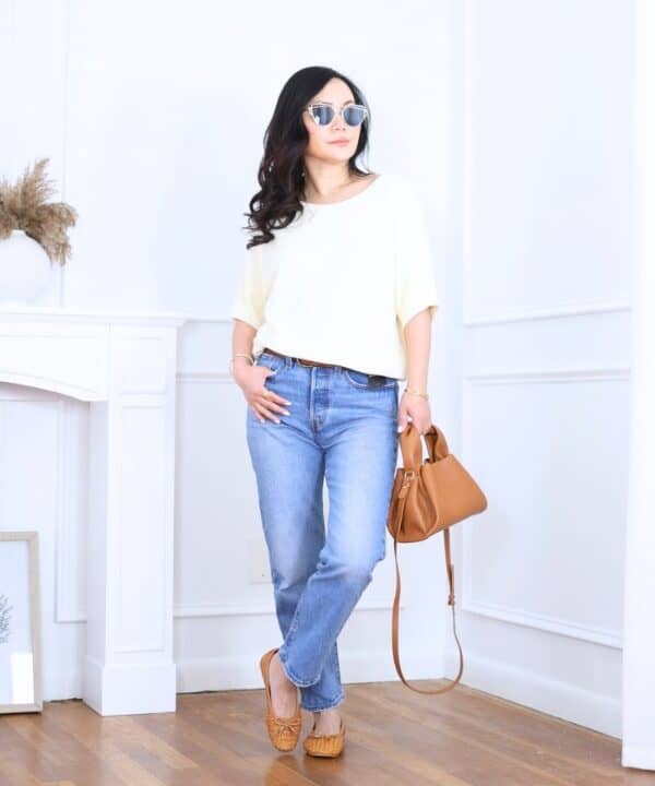 I intentionally tucked it to elongate my legs and layered it over a white tee, which is very on trend right now. Styled with high-waisted ribcage jeans and pointed-toe boots, it creates a taller, more balanced silhouette while still feeling fun and casual.