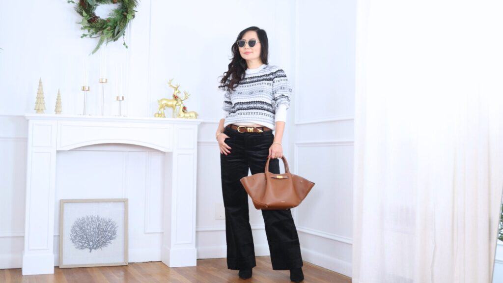 I’m wearing an extra small in this Fairisle sweater and it feels true to size. The higher crew neck is perfect for cold places like northern New Jersey where I live. The sleeve length is just right and the hem sits at the perfect spot where I don’t have to tuck. But if you love tucking like me, it doubles the leg lengthening effect. With black velvet pants and a little heel, this becomes such a flattering winter outfit.