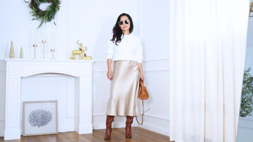 The best part for petites is the length. It hits me right under my belly button, not too cropped, not too long, which elongates my legs. I styled it with my Quince silk skirt and Cognac faux leather boots for a polished winter look.