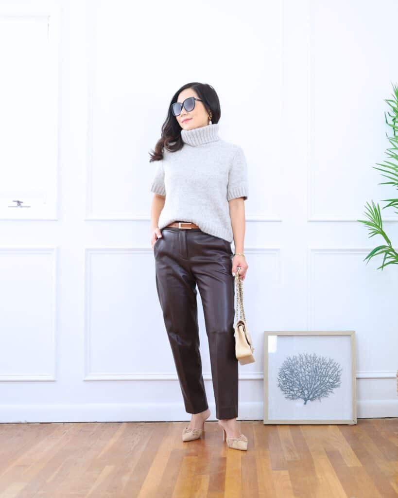 For this look, I paired mine with a short sleeve, chunky turtleneck top and faux leather pants. I added a matching leather belt to tie everything together. The combo of luxe textures and a neutral palette felt modern but still totally wearable for the office. I love how skin-tone heels keep things streamlined and elevate even a simple outfit.